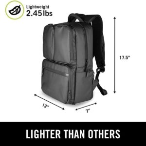 The Kenneth Cole Reaction Ryder Laptop Backpack has multiple tech-focused storage pockets for all your business and personal essentials for work and travel. The main compartment features a laptop pocket that can fit most 17″ laptops, as well as a modular padded laptop sleeve that can fit most 16″ laptops. The modular laptop sleeve has an added accessories pocket for small personal belongings. Three tactical-inspired organization pockets on the front of the bag add organization for tech accessories, business essentials, and personal belongings. The Ryder backpack has 9 interior pockets to keep everything organized. Two side bottle pockets expand to fit multiple bottle sizes, keeping your drinks conveniently within reach. The trolley tunnel allows this bag to slide over the handle of most upright luggage, making it a great option for travel. Backed by a manufacturer’s limited lifetime warranty. Overall size: 17.5″ H x 12″ W x 7″ D. Laptop Pocket Dimensions: 12″ H x 11.5″ W x 1.5″ D. Weight 2.45 lbs. Pack More Into Life with the Ryder Backpack.